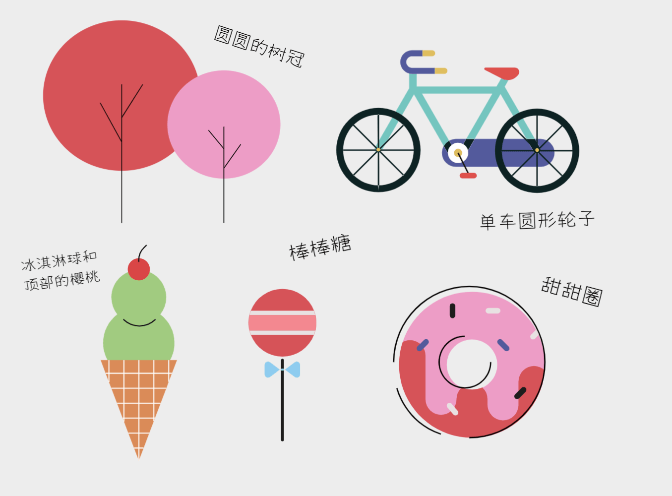 利用圆形可以设计出很多插画元素,例如太阳、水果等,下图可以看到很多用圆形作为构成基础而设计的插画元素,它们的出现能为画面增加一种可爱、柔和的氛围。