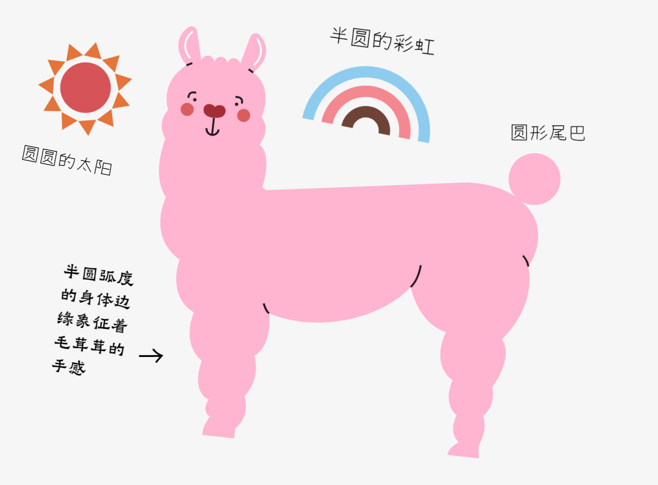 在插画中,圆形的应用也交织着各种组合形式,比如可以单独使用,也可以组合在一个元素的综合造型中,例如想要表现羊驼的可爱柔软的手感,就可以使用圆弧(圆形的部分轮廓)来表达可爱和蓬松,这种手法也被叫做象征手法,象征是一种隐晦的间接的插画技法,目的是达到“四两拨千斤”的效果,简约的风格插画大都使用这种技法来形成自己独特的风格表现。