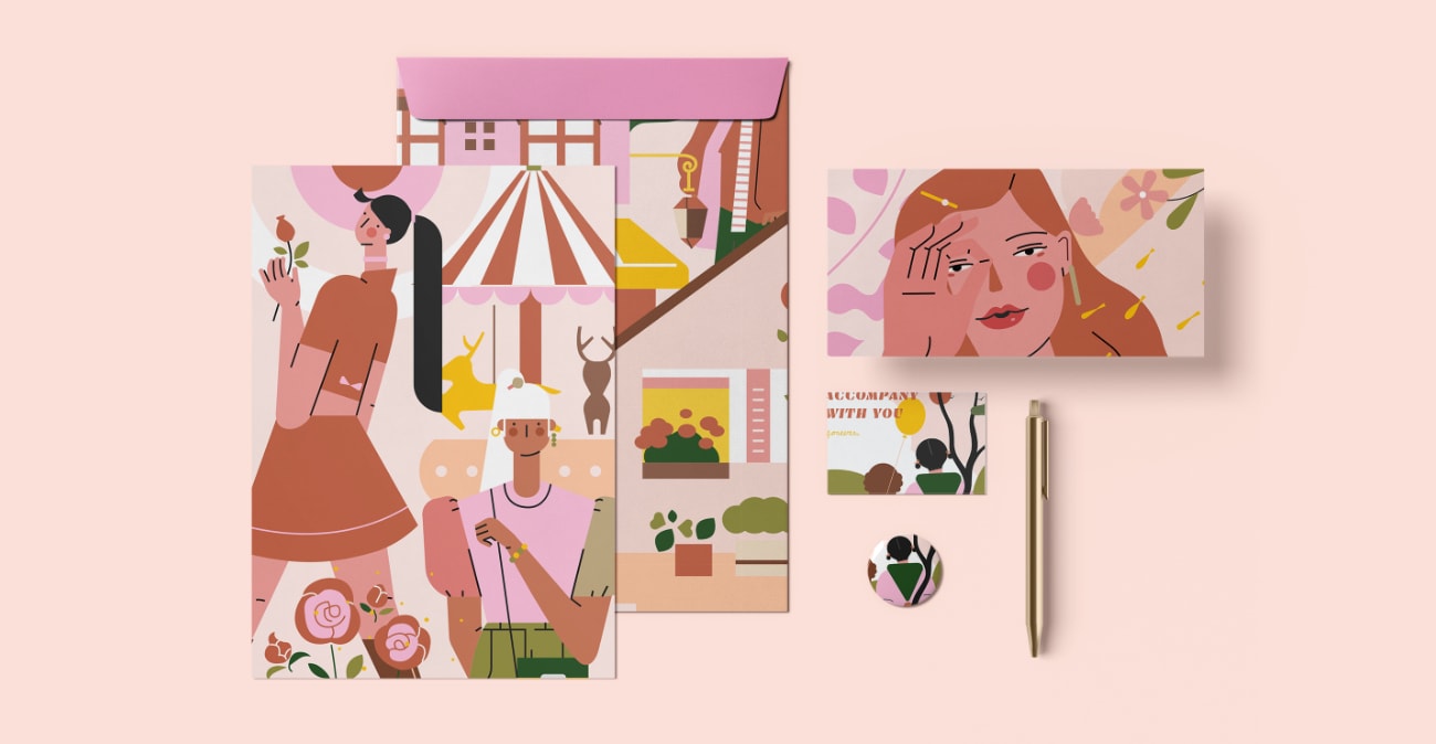 蜜桃金粉的配色是华丽和温暖的,以粉色为主的配色中使用了春桃粉、沙滩粉、烛光粉、珊瑚粉等不同层次的表现,这时采用华盖金和粉色结合充分放大了粉色的感染力,让温柔的粉色也带着力量,同时间杂了作为对比色的军营绿、山野绿等绿色系来平衡红色系的暖意,画面建立了一种温暖的秩序感。