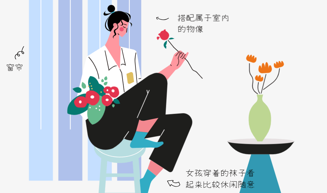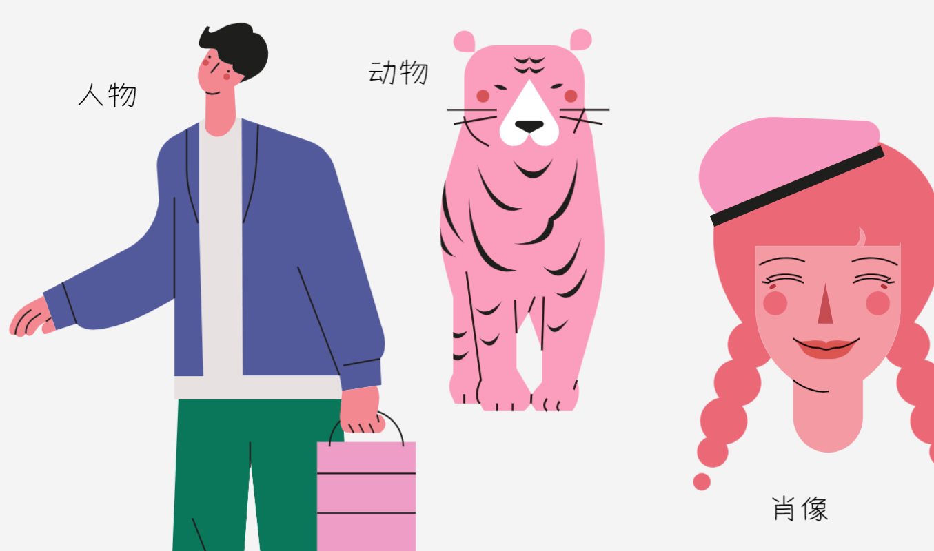 除了一些特殊的艺术偏好以外,普遍来说,具有画面感的插画设计作品有三个层面的表现,第一个层面就是画面角色,一副插画里的角色就像你在插画世界里的“阿凡达”,这些角色大多数情况下是人物,也可以是动物,有时可以是一只手或者甚至一只茶具等等。在小园素的元素分类里,我提供了“人物”“动物”“肖像”来作为角色层面的元素。