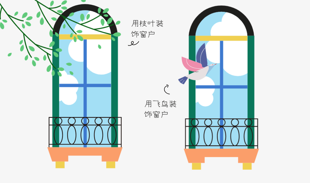 最后,是作为贯穿前景和背景元素的装饰类元素,前两种搭建出的画面感是需要装饰去丰满和进一步发挥。可以是用植物去装饰墙面,或者用云朵去装饰天空……能用作装饰的物件五花八门,但都是合理的,不能太过反常识。我在小园素安排的属于装饰类的类别可以是“氛围”“天气”“图案”等。