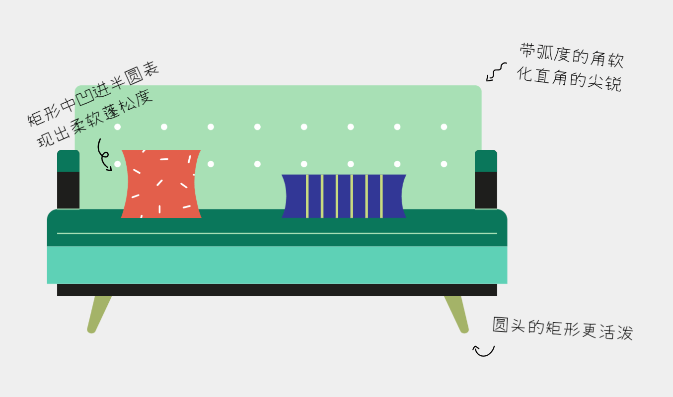 矩形的使用比圆形来得更为容易,它很容易制造出结构感,但也很容易看起来不够灵动,显得笨拙。要改变这种笨拙感,制造出更多温暖和柔和,就可以将尖锐的直角改变为圆角,软化直角的坚硬和锋利,比如我在画家居类元素时,我就使用大量圆角的矩形元素来进行组合。