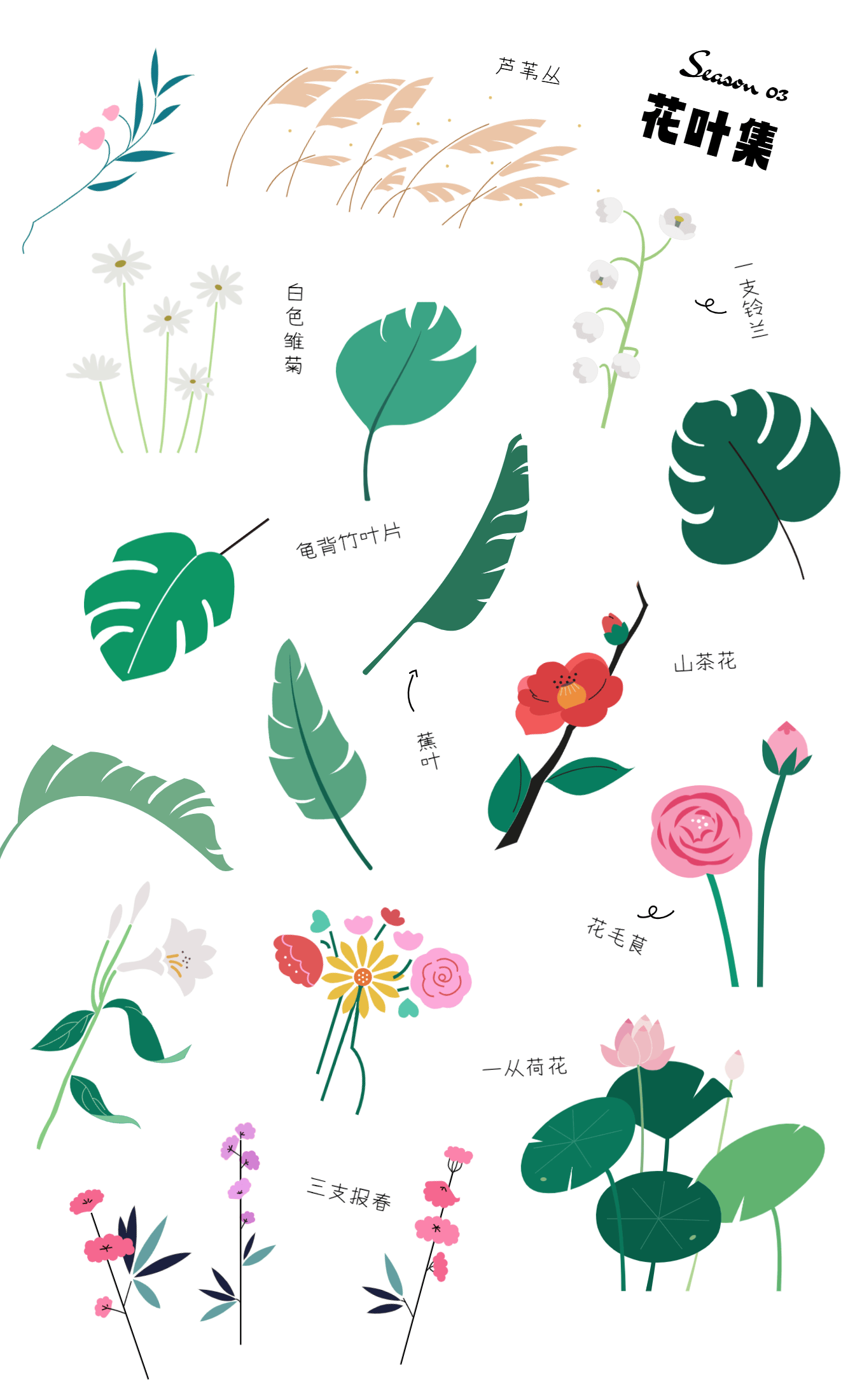 这一集的花叶表现开始趋向于花丛和花朵的集合展示,比如报春花,我画了三支,这是为了花朵元素在使用的时候可以成片的铺开形成一种更浓郁的氛围,形成花丛、花园等等景观的展现,而独立的花朵,比如山茶、花毛莨、百合只是开始创作的第一个元素,在未来会继续以花的品种铺开。