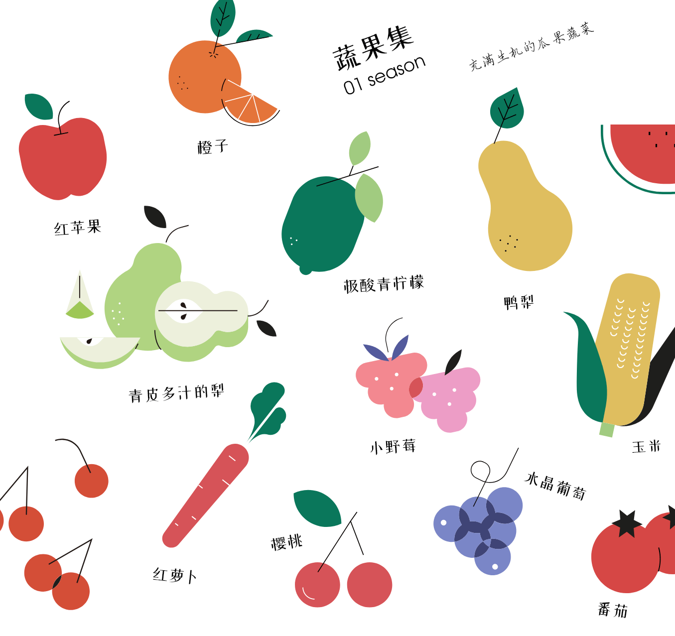 蔬果是非常容易入画的元素,它的造型是非常简单的,却又因为简单而不容易做出独特的造型,容易在简单的形状下显得单调乏味,因此我在每一个蔬果造型的设计上都尽量用一种独特的表现方法,这也是我琢磨比较多的造型品类,在应用的时候,蔬果能表现一种田园感觉,也能帮助阐释美食的滋味,因为它们本身的新鲜和氛围链接了大自然,也帮助我们更深了解这个地球的季节面貌,它们是美丽的也是丰富的。