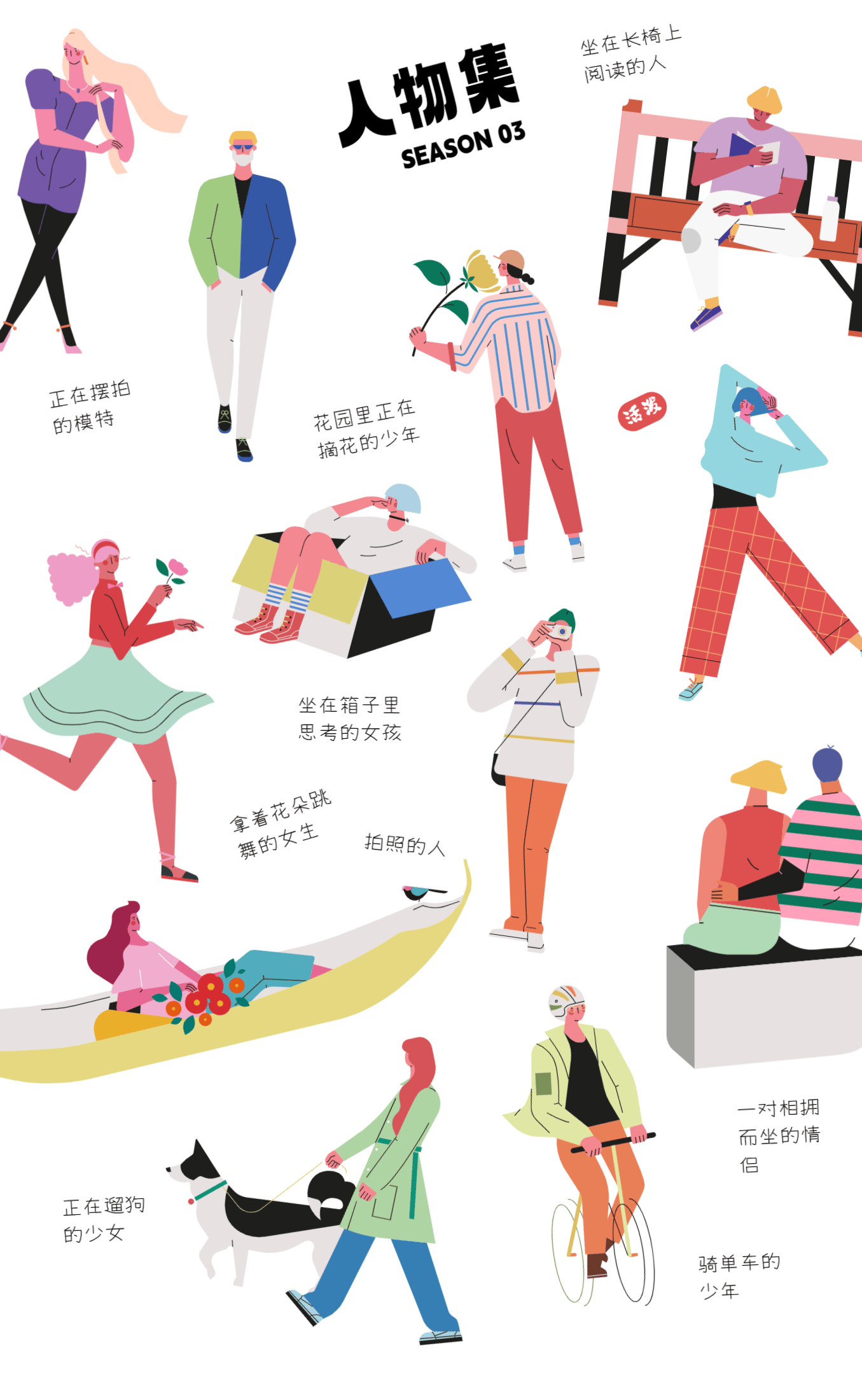这一次我所画的人物开始有了更多的生活情态,大部分人物都有了更多的外延“装备”,比如有的人物是坐于正在航行的船只、公园上长椅上甚至坐在箱子里等等,有的人物则是牵着自己的宠物狗,或者拿着硕大的花朵正在嗅闻,骑着单车……这些人物的生活形态就更加的具体和明确,在应用这些人物的时候,就会更容易形成一幅插画,即使是单一的人物元素,也能快速形成一幅成熟丰满的画面,而往上增加其他的元素也更具有方向感,也更容易激发空间的活力衍生。有些人物则更偏向摆拍的姿态,这类人物元素更易于融合画面里的美感元素,应用范围也更加的宽泛。