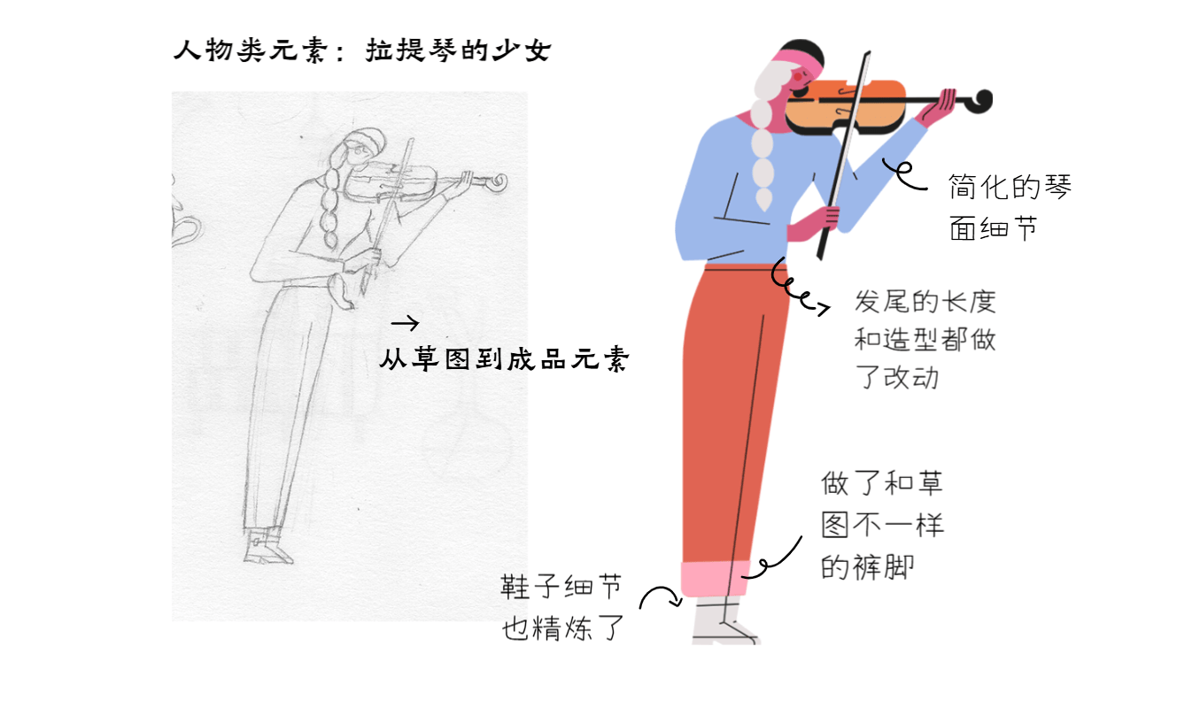 在小园素的插画元素设计过程中,每个元素在草图设计阶段就要先做一个评估:在元素造型上能与其他所有元素形成一个整体,因此,这需要非常纯熟和微妙的对造型风格的敏感度把握,从草图设计到最后呈现造型成品时,会有很多思考的细节需要打磨。