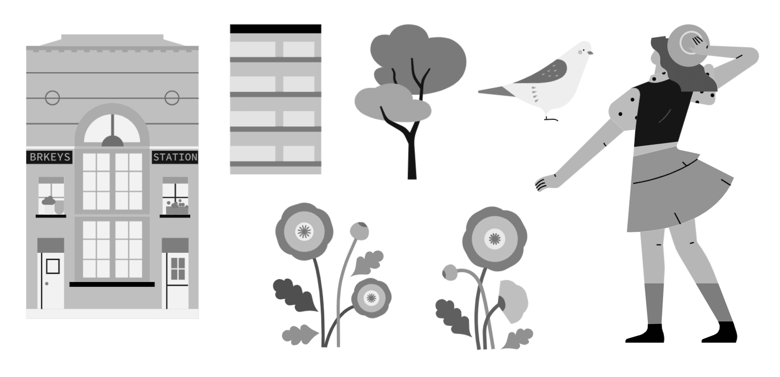 建筑用来做背景,和人物背影在一起就很容易营造一种空间氛围,同时放一只鸽子在人物的脸部看向的地方。这副插画我用的是鲜亮橘蓝作为背景。
