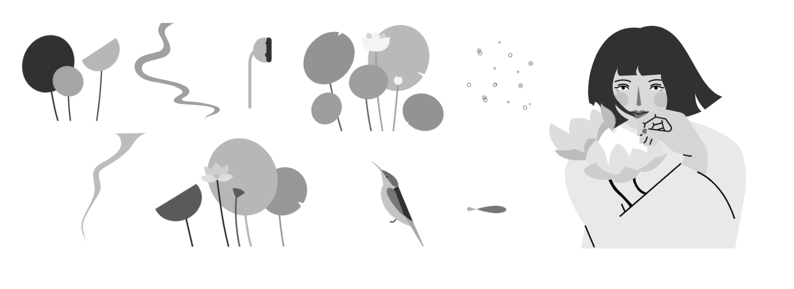 刚画好了三丛荷花元素,立刻组合起来,一起入选的元素都几乎比较适合整个水系场景,氛围感元素也使用较多