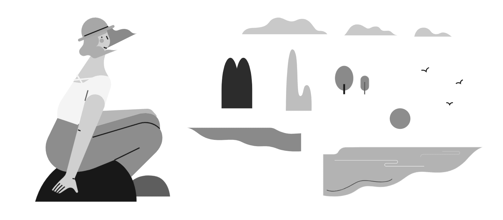 在组合这幅画的时候,想要表现的是那种湿润的感觉,但在扁平插画里想要表现这种触感实属不易(好像是无处下手),这时我想到的是用坐在水边的人物来表现,而这个水的画法仍然采用抽象形状,这样来组合一副画,也是第一次尝试。