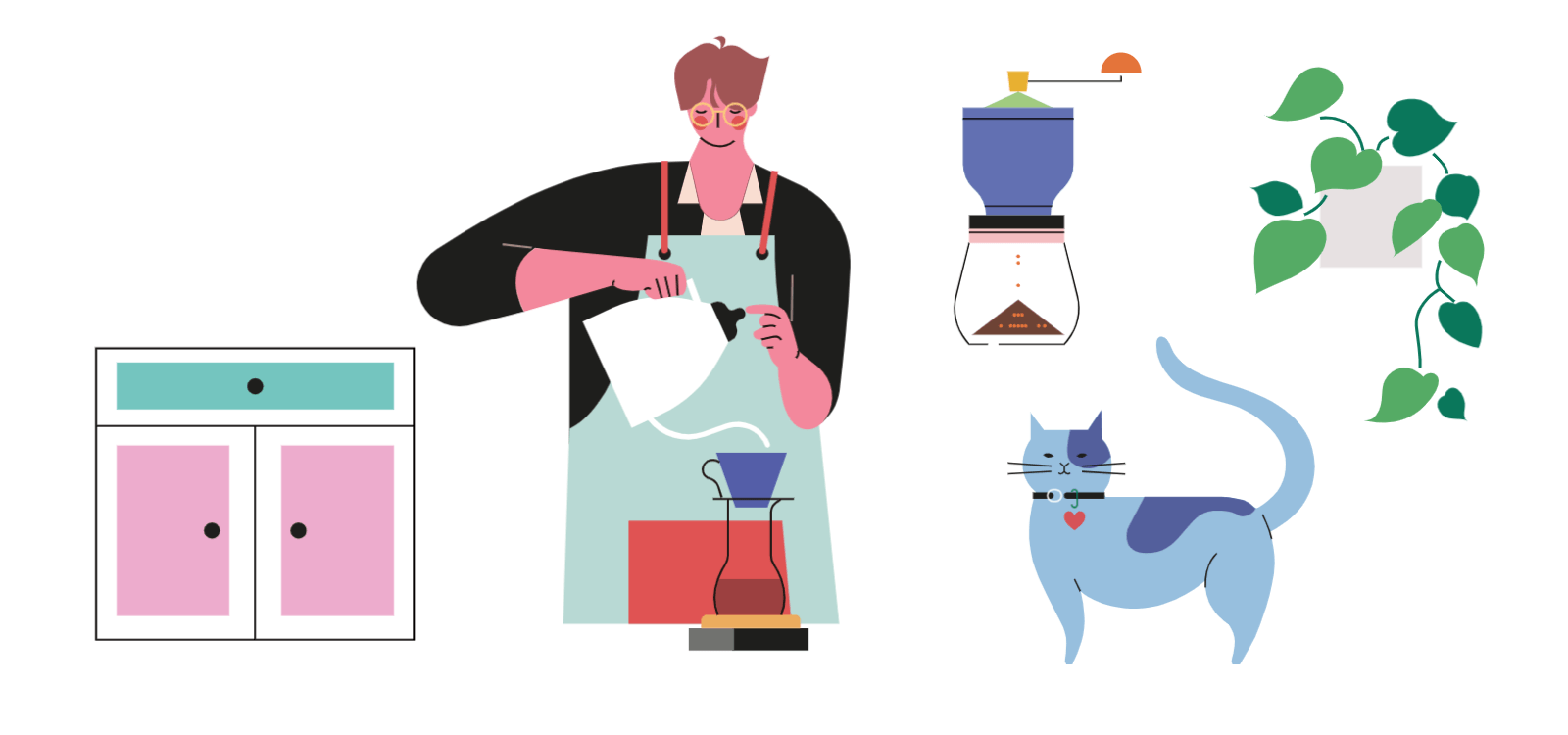 咖啡未满 使用元素:家居、人物、动物、陈设、餐饮 | 配色风格:氛围奶黄 开始编辑 主要使用元素 完成作品 将氛围奶黄作为这幅插画的配色 抱枕枕套插画设计 用插画做抱枕枕套的好处就是可以随时随季节更换,有时来点这种满满当当的画风也不错!