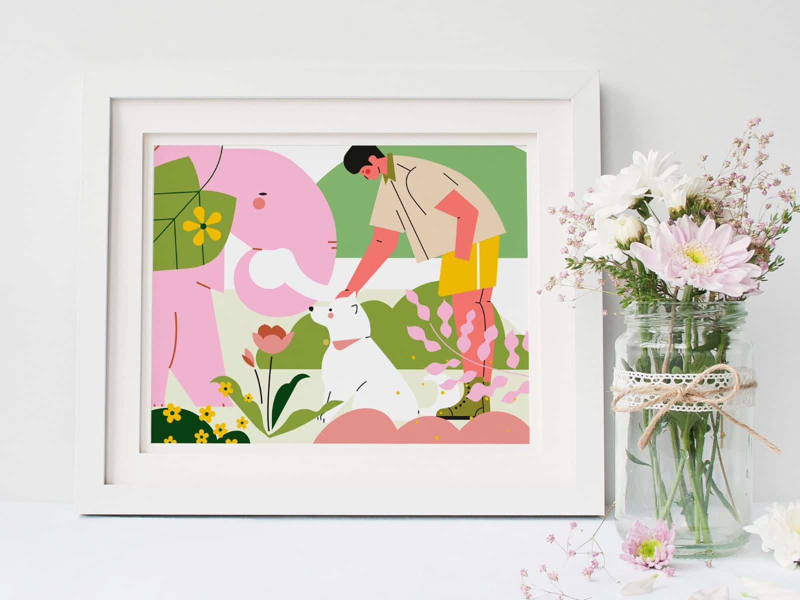 使用元素:人物、动物、植物、形状、氛围 | 配色风格:天真粉绿