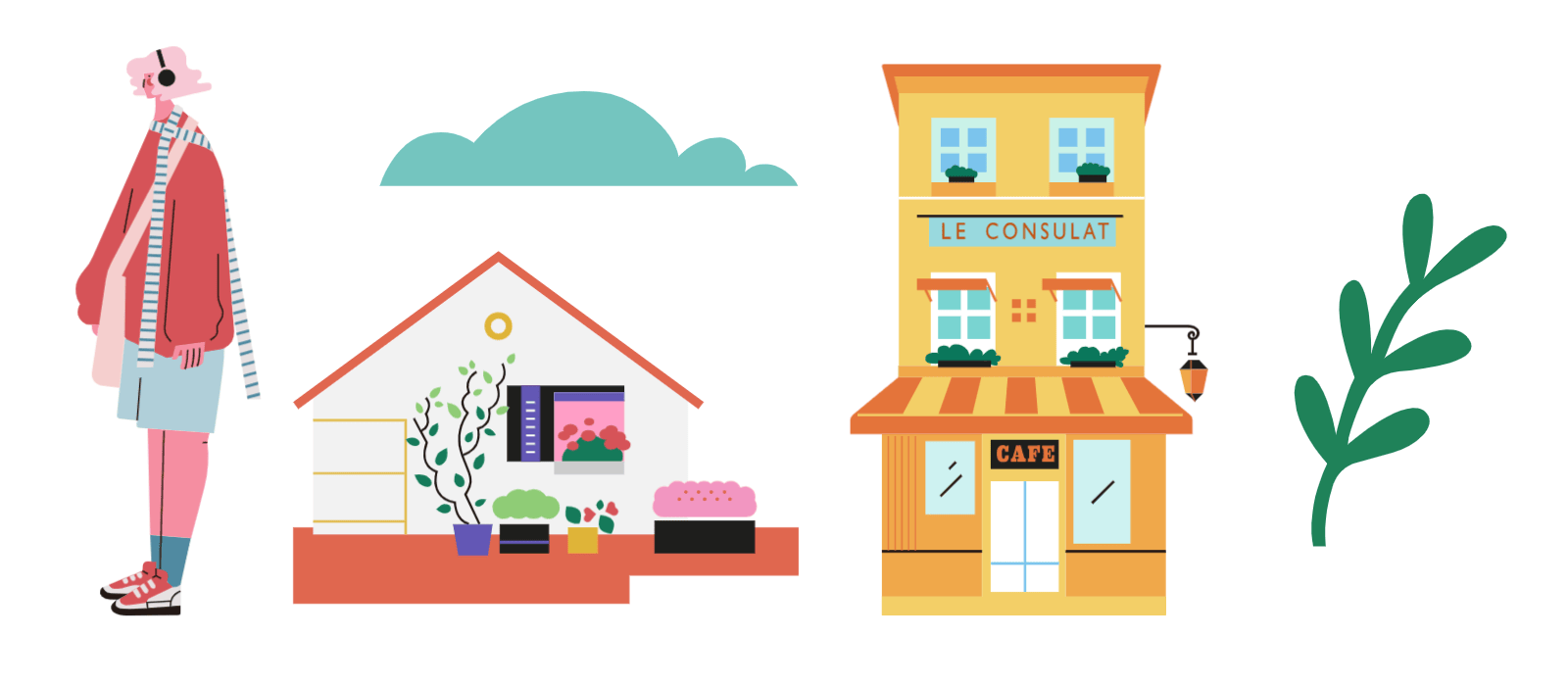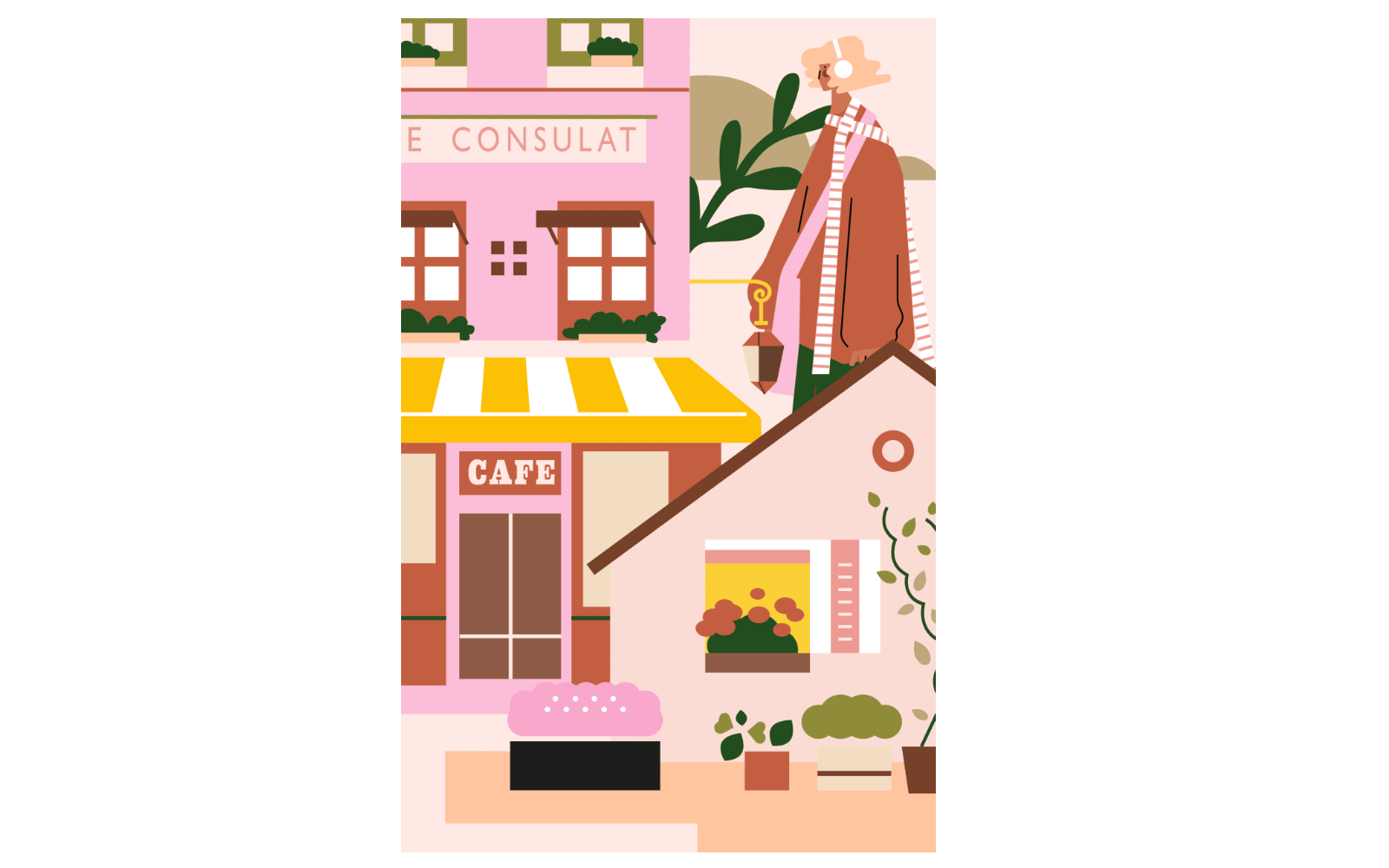 使用元素:建筑、人物、植物、形状 | 配色风格:蜜桃金粉