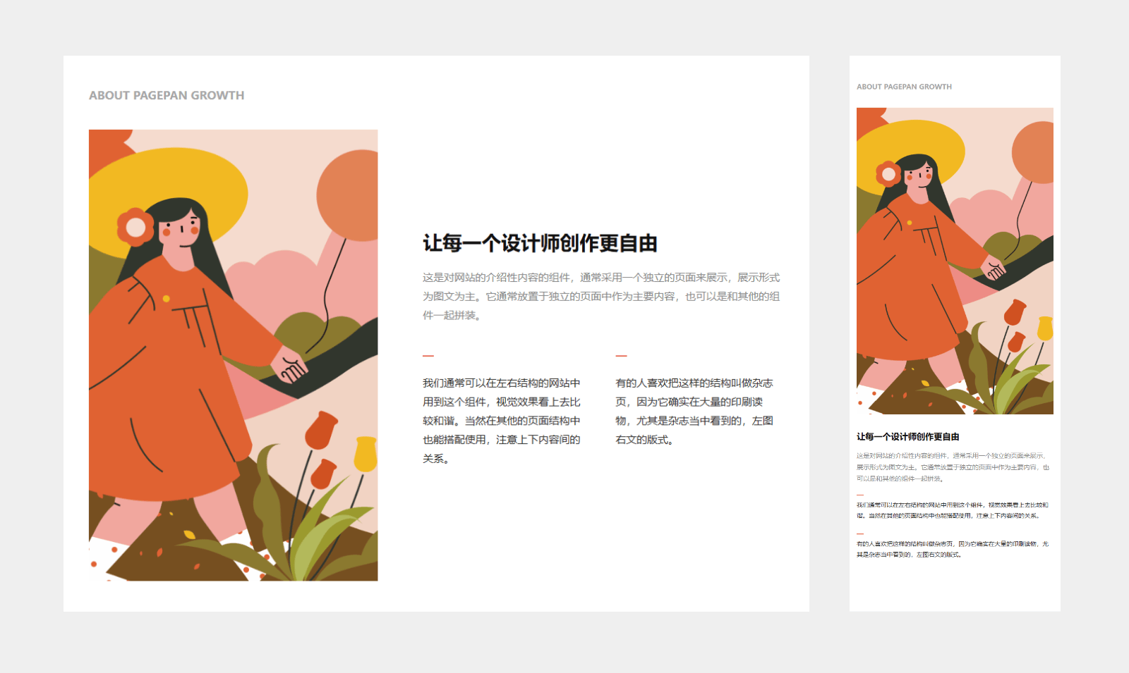 为小飞页中的【关于】组件配上左图右文的插画图片,下面是不同屏幕尺寸下的展示效果