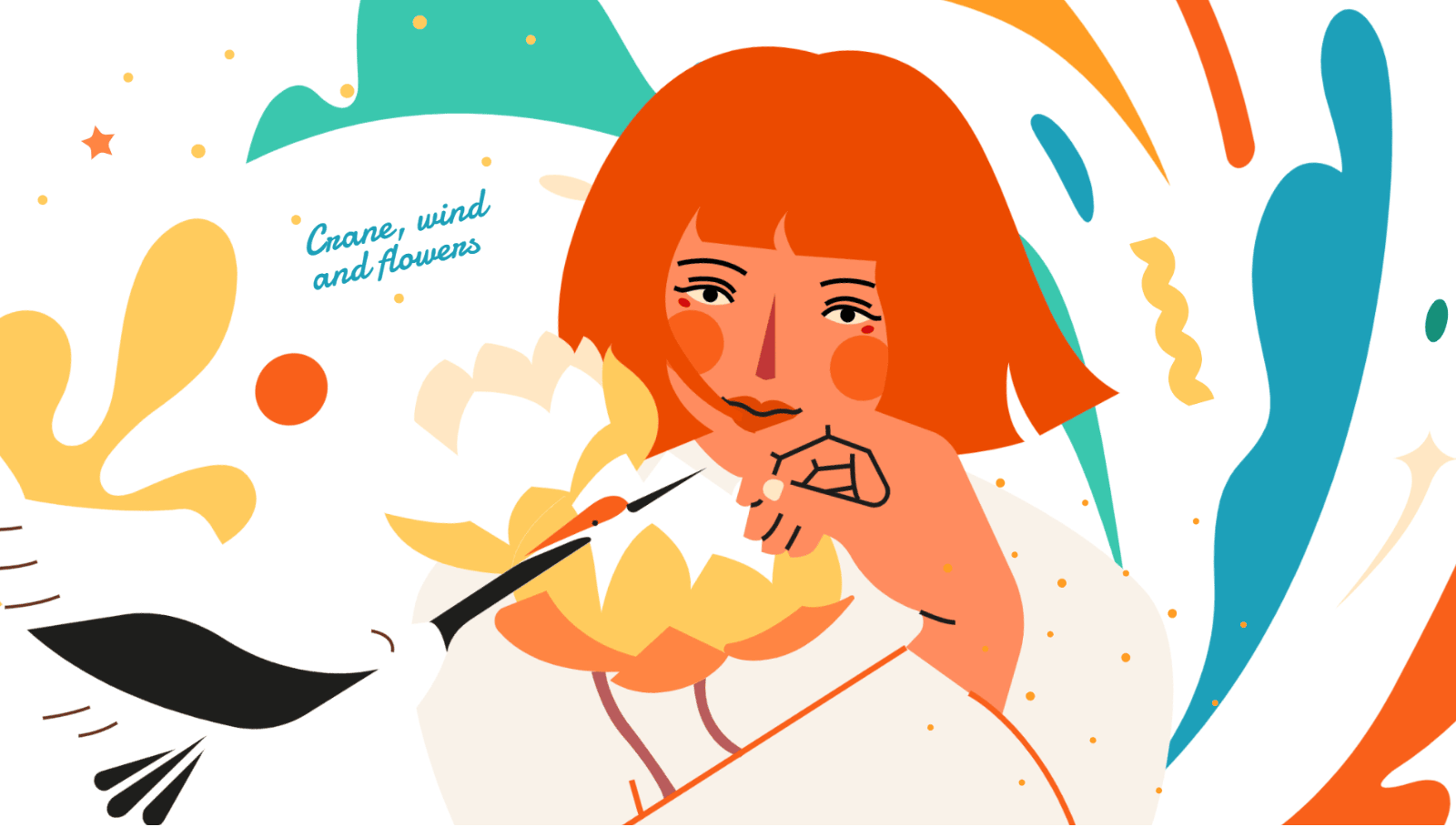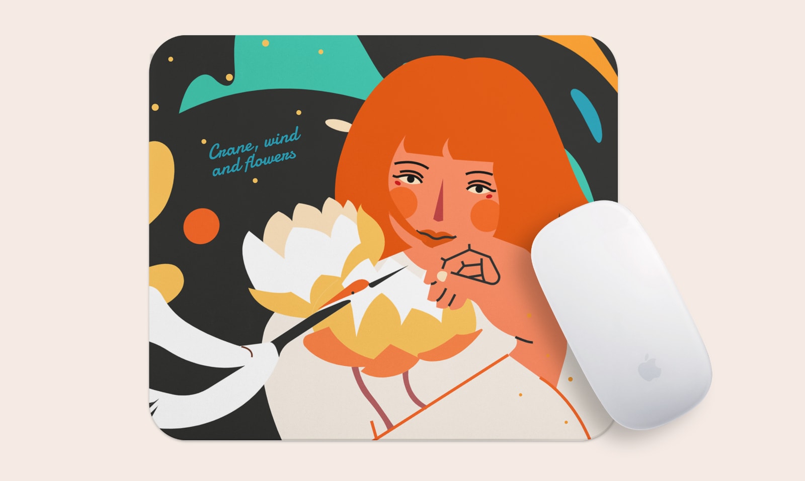 鹤、风与花 ② 使用元素:肖像、动物、形状、背景图形、氛围 | 配色风格:氛围奶黄 开始编辑 这幅作品是对原有的鹤、风与花①的修改,整体的构图思路并没有改变,在原图基础上我重新减少了元素的使用,重点突出了人物肖像鹤鹤的互动,背景换了更具凝聚力的圆环状背景图形构造出梦幻与动态,并且使用了氛围奶黄来重新配色。 主要使用元素 完成作品 将氛围奶黄作为这幅插画的配色,先来一个暗夜版。 这是白光版。 鼠标垫插画设计 考虑到鼠标垫会容易弄脏,所以使用暗夜版会更合适。