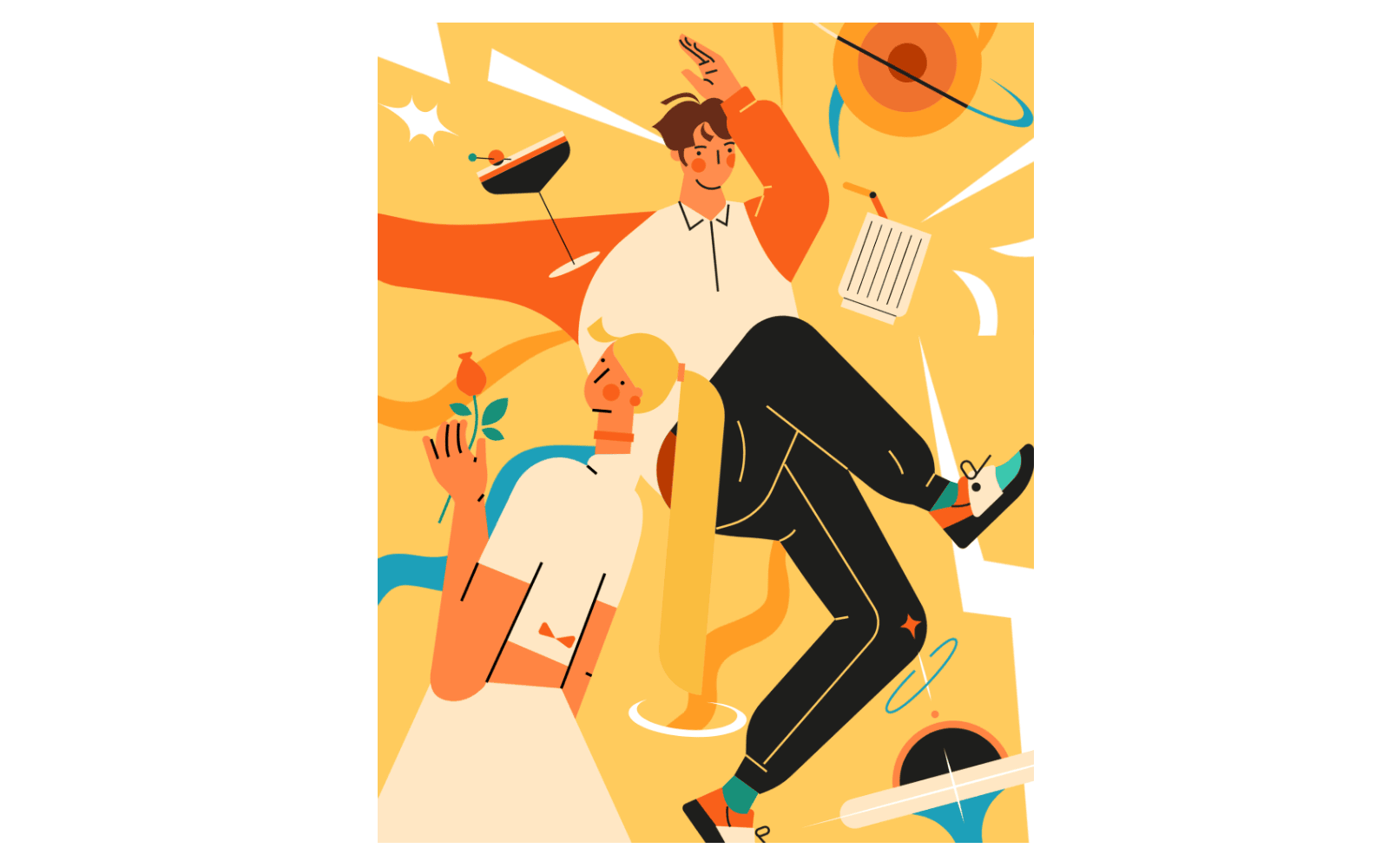 热烈 ② 使用元素:人物、餐饮、氛围、太空、形状 | 配色风格:氛围奶黄 开始编辑 这是对热烈①这幅作品的调整,整体构图并没有改变,人物角色和背景氛围都基本保持了原状,其中我换掉了狗狗,增加了太空的元素来进一步强化这幅画的新奇之感。 主要使用元素 完成作品 我使用了氛围奶黄作为这幅插画的配色。 海报插画设计