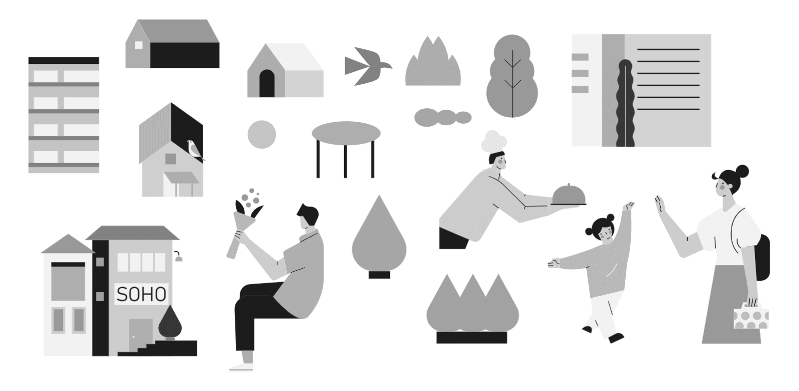 使用元素:人物、儿童、建筑、植物、家居、形状 | 配色风格:静涩奶蓝