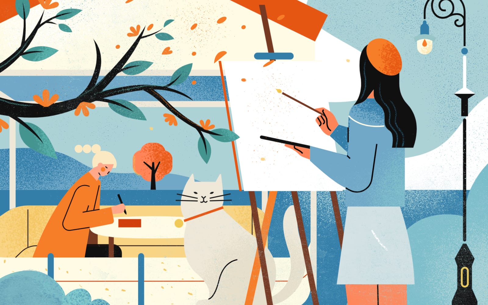 使用元素:人物、建筑、动物、植物、形状、氛围、背景图形 | 配色风格:鲜亮橘蓝