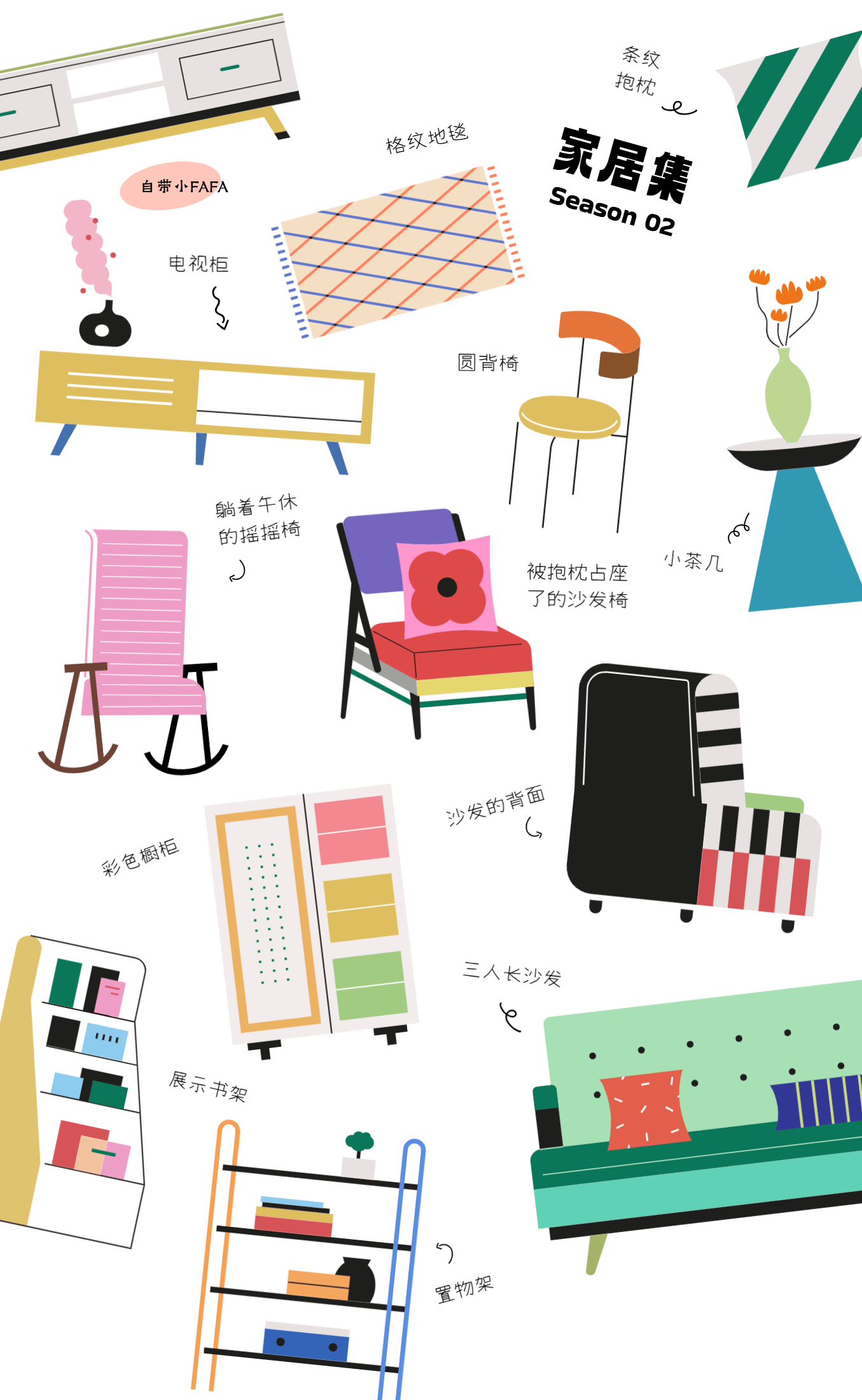 家居生活物件主要集中在家具和软装这两个方面,在第二季的家居系列的元素创作中,我所画的都是已经组合好了的物件,比如柜子上安排了花瓶、置物架上放满了物品……我想要大家使用时可以直接拿来应用而不需要继续添加更多物件,除非你有兴趣拆散这些组合。当然,其实家居的元素不一定是要使用在室内的,有很多物件可以结合到户外一样能表现传递出更多新鲜的氛围。