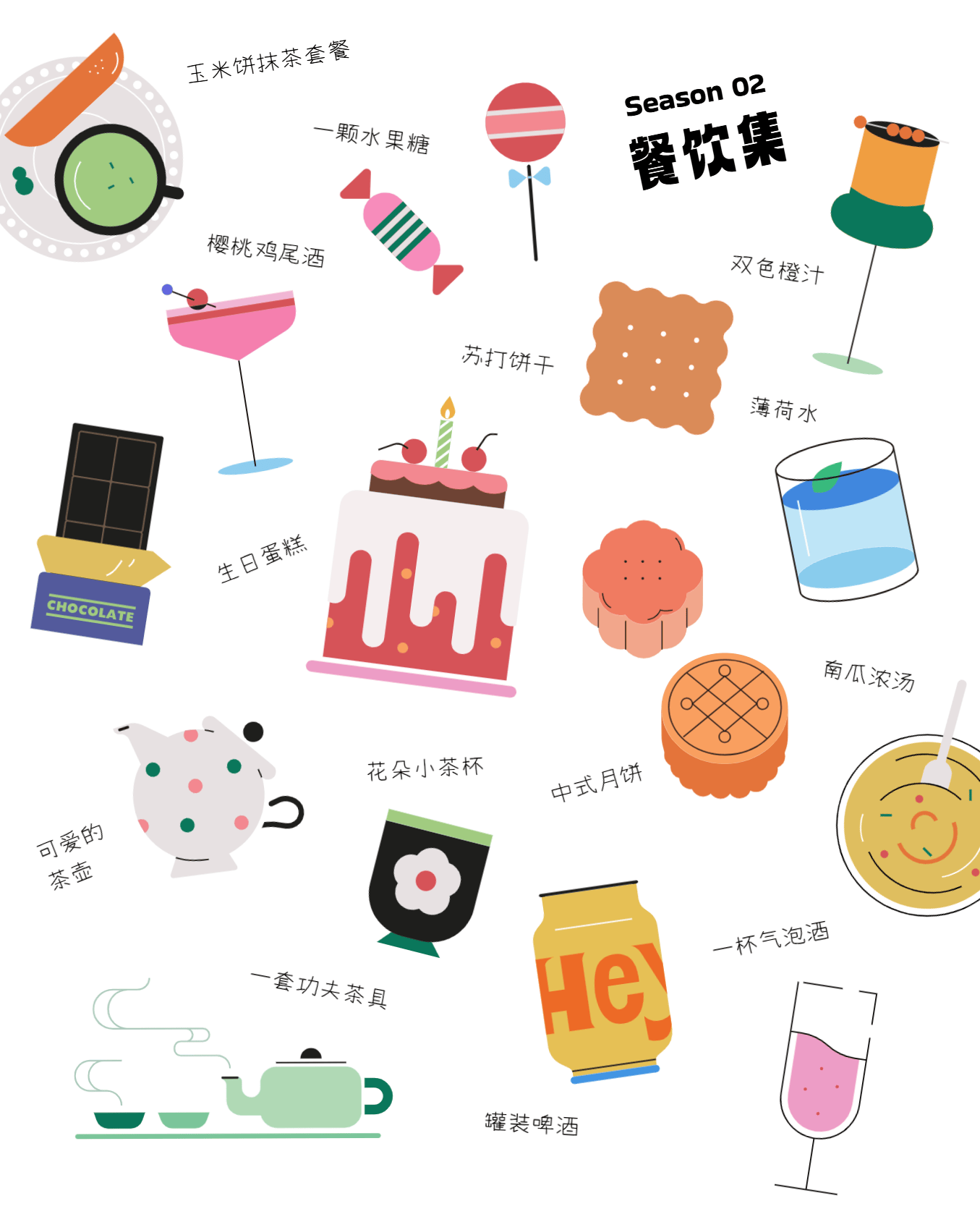 BACK 美食时光 May 22 2024 这一次我画的美食更像是美食容器和包装的展示,因为色香才会味美,这尤其从视觉上带来一种引导 美食的外形给人以一种可爱、温暖的安慰,在使用美食作为插画元素的时候,我发现更多它能带来一种意象的提示,而非直接的画面解释,比如我们使用一杯薄荷水来表现出一种冷清、透明的氛围感。美食不太适合作为场景组件使用,但可以在很多“散装”的造型里安排出淘气活泼感。