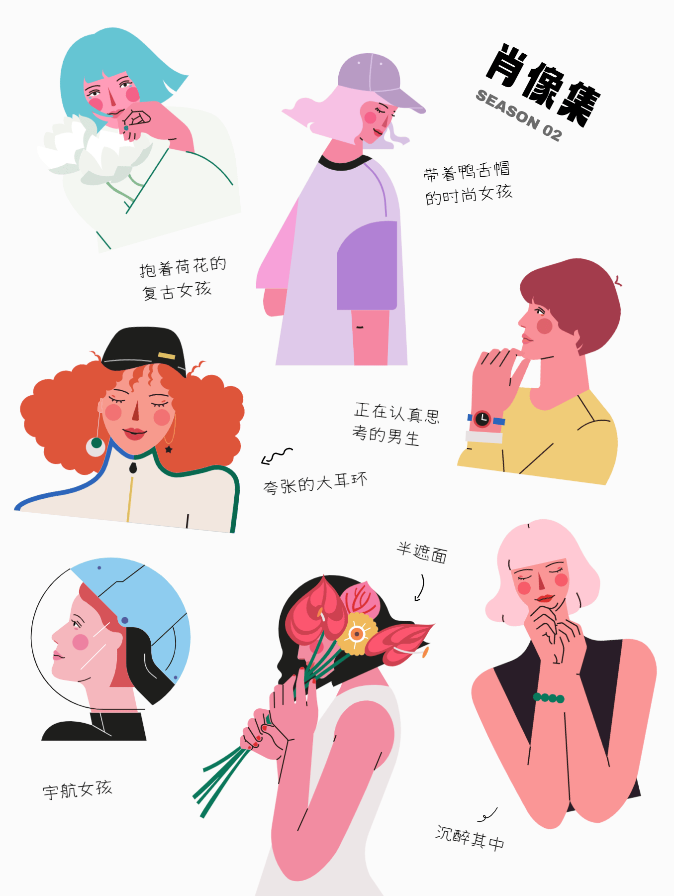 第二季的肖像画里我增加了人物手中所拿的花朵的元素,或者是人物带着宇航员的头盔等等,这样的一种描绘会更加直接彻底,花朵是非常普遍的一种审美型的元素,同时也能美化氛围,这样的人物肖像看起来更为“入戏”,也更容易直接单个元素就能形成场景,它属于复合型元素。