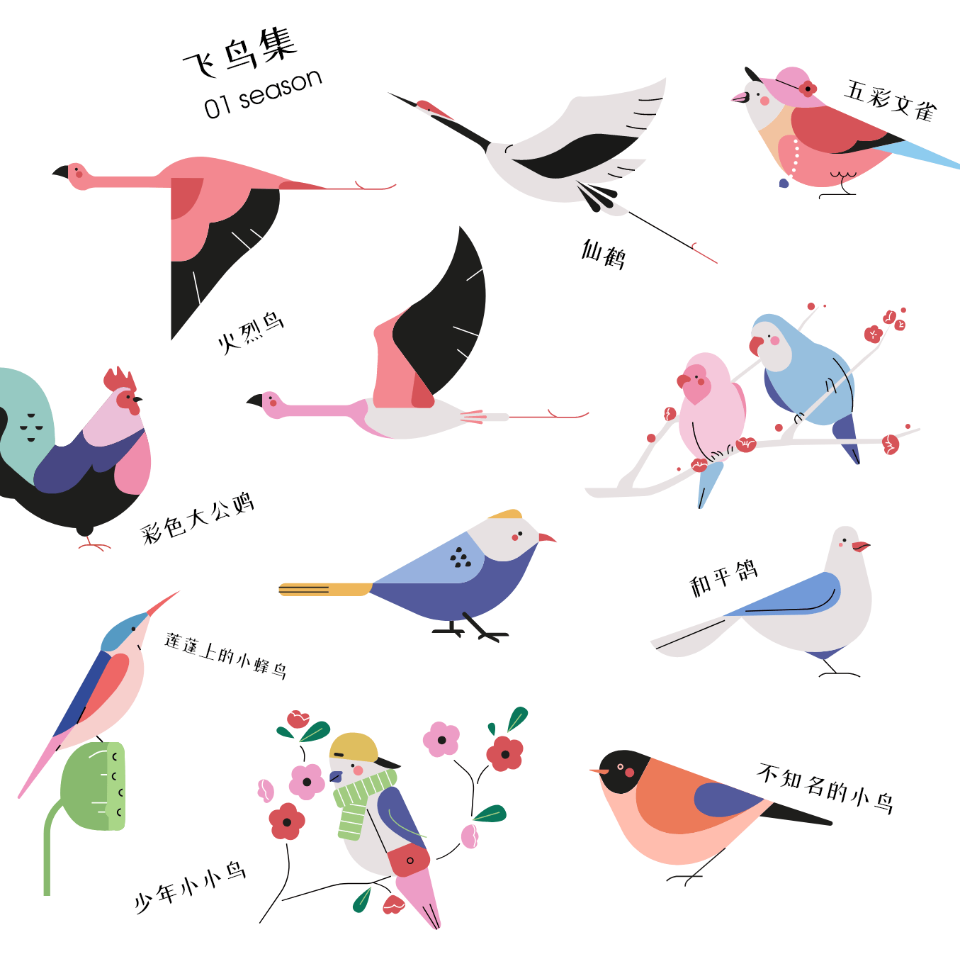 BACK 飞鸟之姿 October 19 2023 鸟是一种非常绚丽的存在,它们的姿态呈现流线型,羽毛色彩丰富 飞翔的鸟儿可以穿梭在天空中或者翱翔在云间、山间或者树林、海洋的上空,栖息的鸟儿呈现一种安静的神态,更适合表现拟人的角色,或者停息在枝头,自来就是吉祥如意的圆满象征。