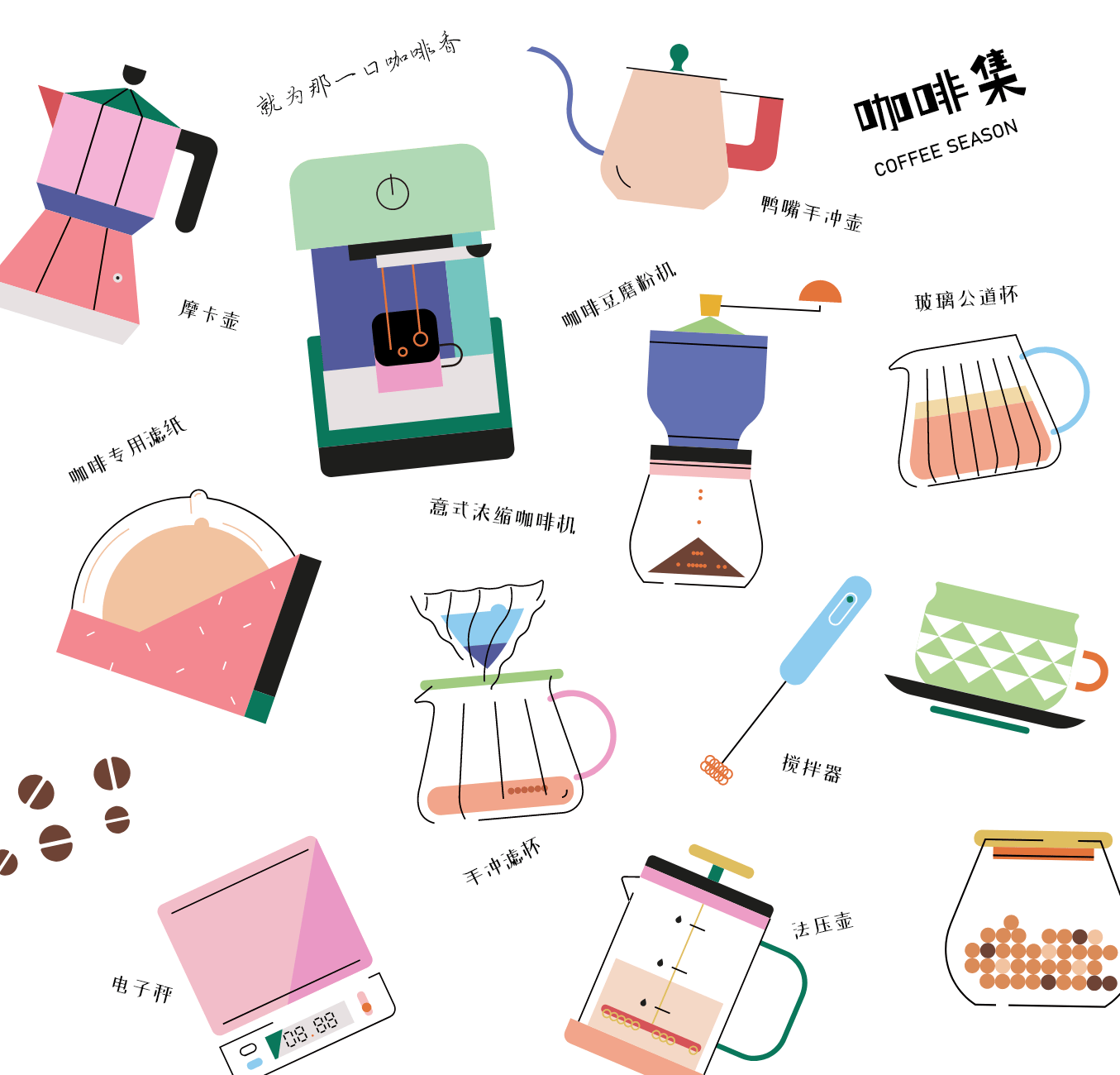 咖啡是一个我很喜欢的品类,我从一个只懂速溶咖啡的普通学生,到成熟为体验过挂耳、手冲、法压壶、意式浓缩自动咖啡直到最近这一年开启的摩卡壶煮咖啡,从咖啡的成色和香味,它都会有不同程度的表现,这对于还没有打开这个世界的你来说也许有点陌生,但没关系,在创作这一套元素时也是想记录自己这一爱上咖啡的旅程,希望你也能一起欣赏。