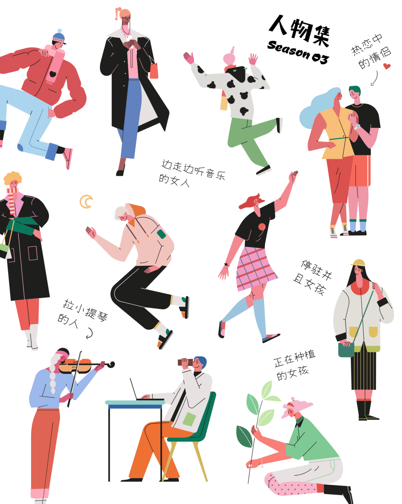 这一组人物灵感来源于对人物更多形态的把握,虽然人群看起来相似,因为个性观念的不同而有着不同的装束和姿态,这些都被画笔记录了下来,我很热爱时尚感的年轻人,所以画的人物基本都是年轻的神韵居多,也许是因为内心还是喜欢有着跃动和青春的印记吧~