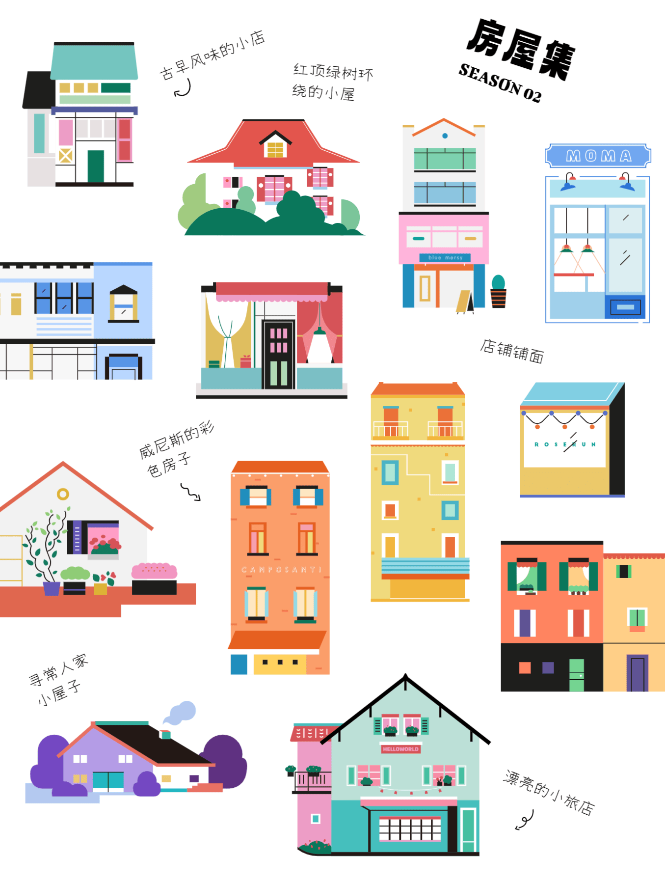 建筑除了居住功能,还有满足商业需求的店铺铺面等,更有甚是在旅游胜地中为了吸引游客的更为精致优雅的建筑,这些建筑同时兼具了审美、停驻的特点,它们也是城市景观最好的背景视觉原料,在画这组建筑时,我使用了鲜艳明快的色彩,让城市成为一种视觉养料,充分给于建筑几何和有机植物细节的结合,比如有些建筑巨细到了窗帘、窗户、窗台上的花朵等,这些元素都属于复合型元素,如果没有特别需要,只要一个元素就能成为一副插画。