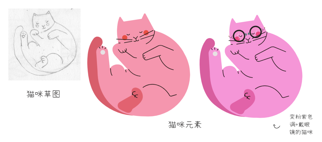 前面讲了传统的插画设计步骤的开始必备,接下来,我们就来讲非传统的部分,就是我们所提供的像小园素这类创作工具,就像我已经把猫咪画好了,你只需要在此基础上“高屋建瓴”,你可以改变猫咪的色彩,甚至给它增减细节,但因为没有从头开始创作,你也许不能改变猫咪的动作和大结构。你的创作焦点就从一张白纸开始画一只猫咪,变为了设计猫咪的色彩和其他元素之间的视觉关系。