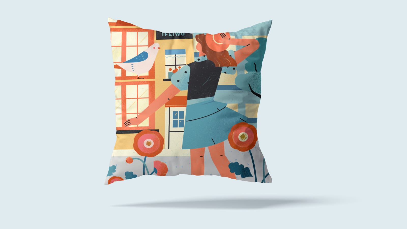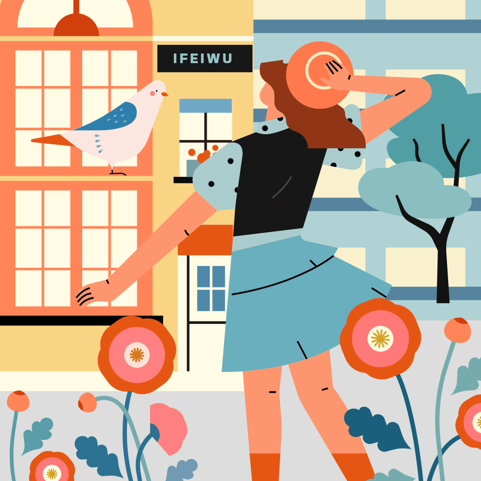 建筑用来做背景,和人物背影在一起就很容易营造一种空间氛围,同时放一只鸽子在人物的脸部看向的地方。这副插画我用的是鲜亮橘蓝作为背景。