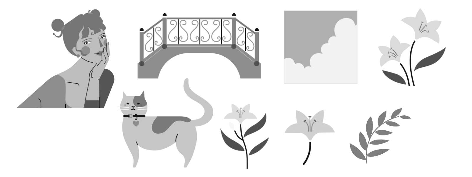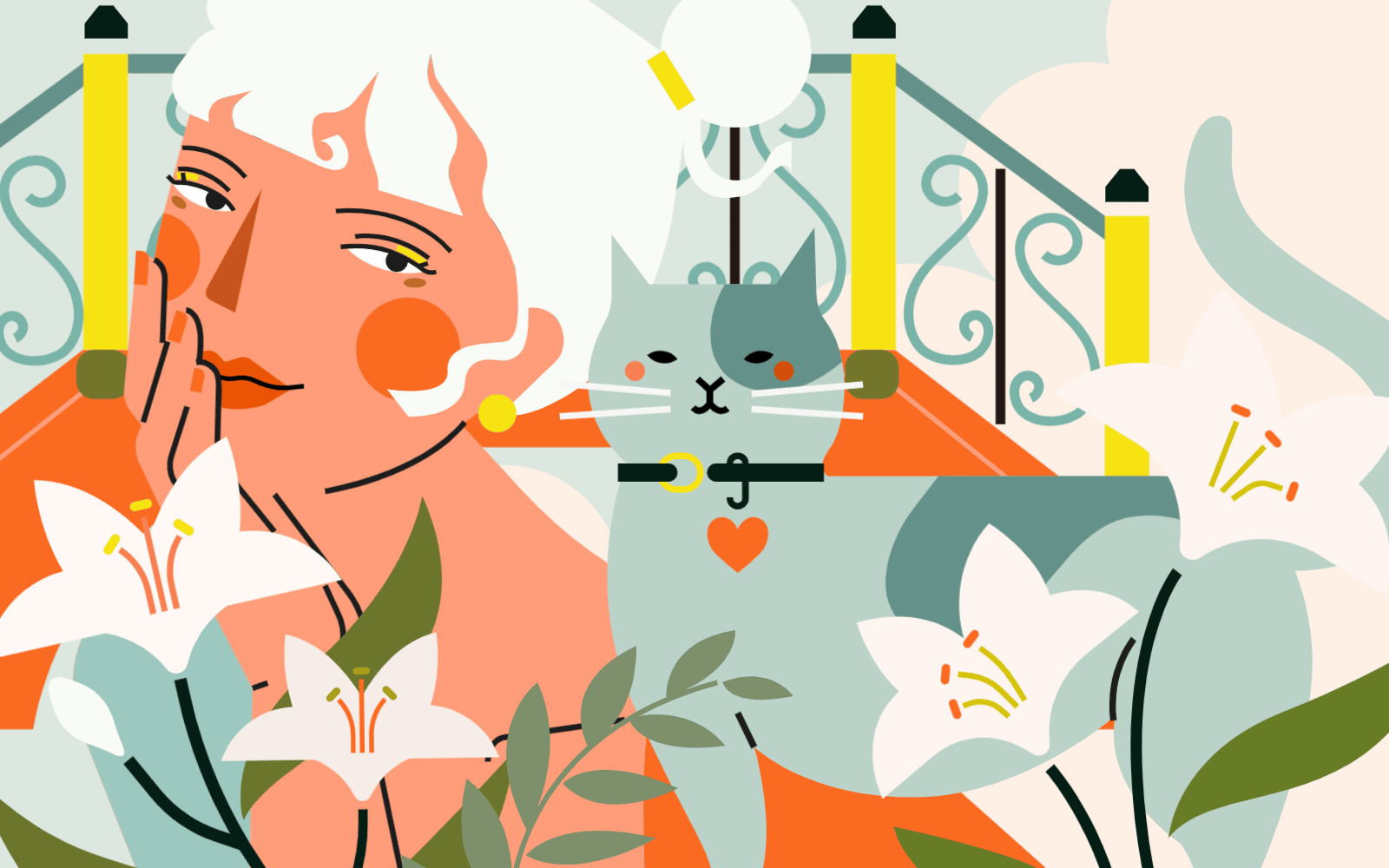 组合在一起,作为欧式桥身的建筑元素可以当做背景,和简单的图形背景融合在一起,构成画面的纵深空间,人与动植物在一起完美和谐的画面一直都是我插画里的主要表现主题,这里我所使用的是温柔米橙这个配色风格。