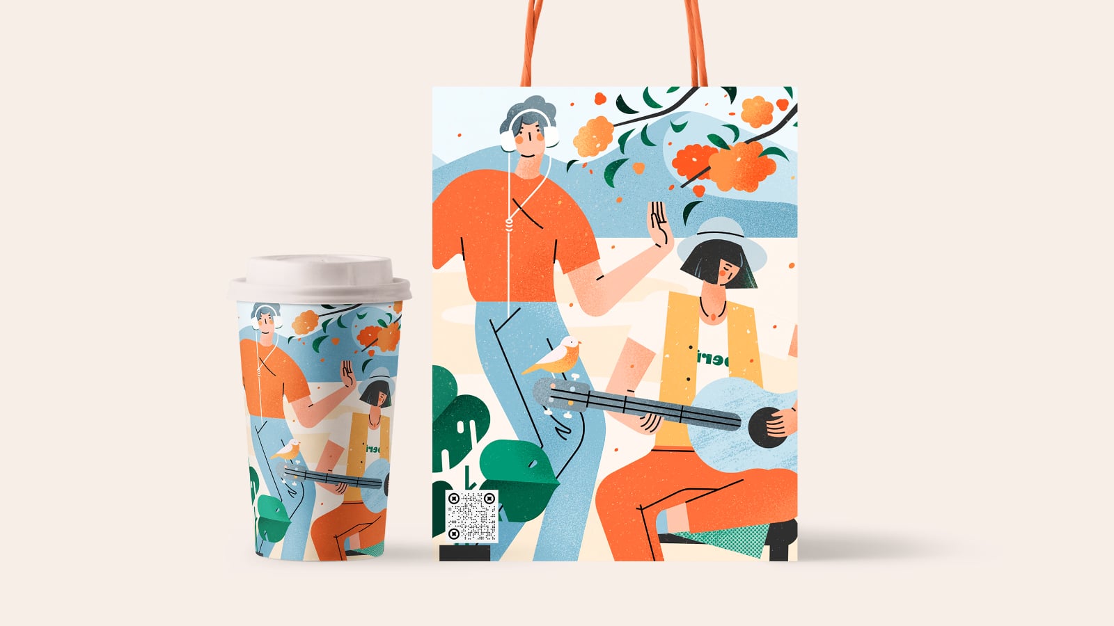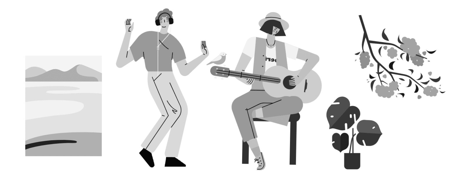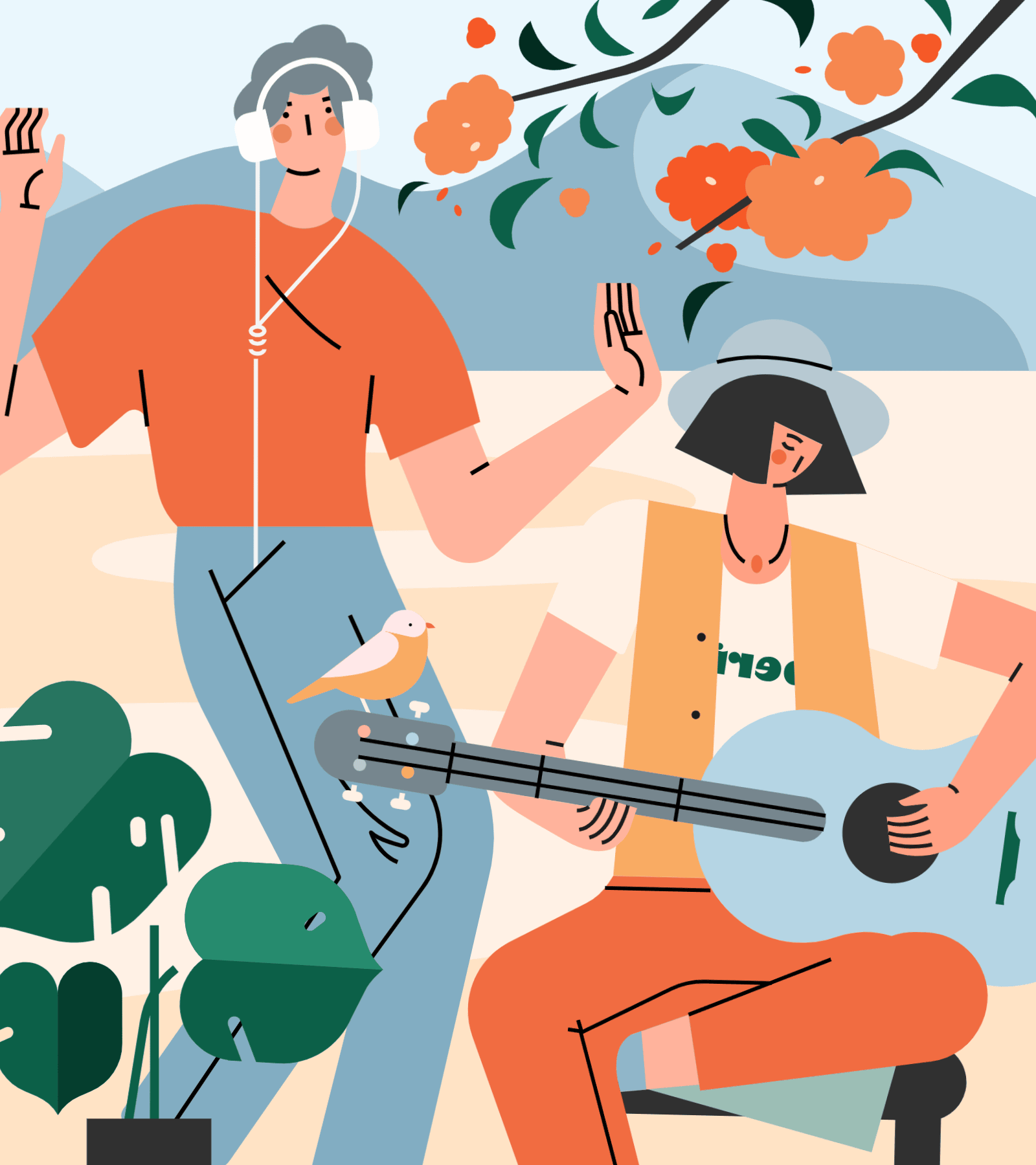 和歌 使用元素:人物、植物、背景图形 | 配色风格:静涩奶蓝 开始编辑 主要使用元素 最近画好了两个人物元素,都是适合音乐的主题,所以把他们放在一起 完成作品 这幅作品以静涩奶蓝作为配色风格 在PS里我继续增加了一些肌理和细节刻画 饮品包装插画设计
