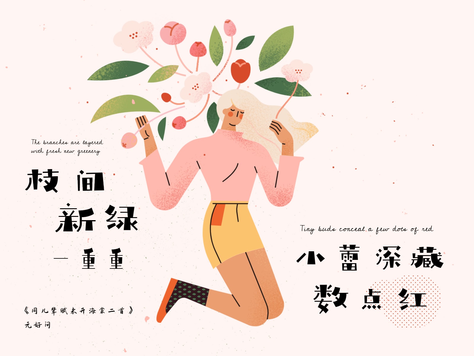 “枝间新绿一重重,小蕾深藏数点红” 使用元素:人物、植物 开始编辑 主要使用元素 完成作品 《同儿辈赋未开海棠二首》(其二)枝间新绿一重重,小蕾深藏数点红。爱惜芳心莫轻吐,且教桃李闹春风。——元好问 在PS里刻画细节铺陈纹理