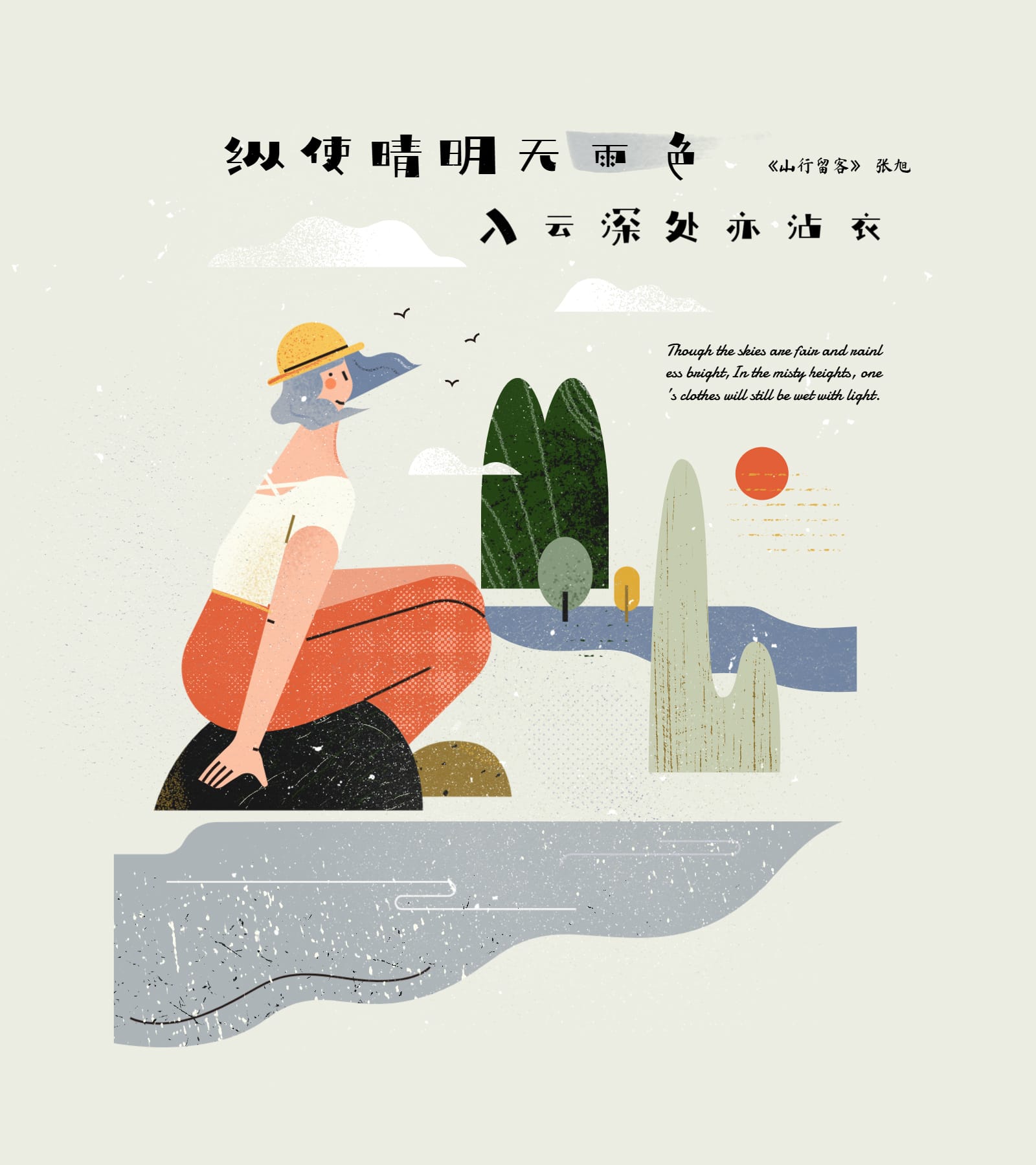 在组合这幅画的时候,想要表现的是那种湿润的感觉,但在扁平插画里想要表现这种触感实属不易(好像是无处下手),这时我想到的是用坐在水边的人物来表现,而这个水的画法仍然采用抽象形状,这样来组合一副画,也是第一次尝试。