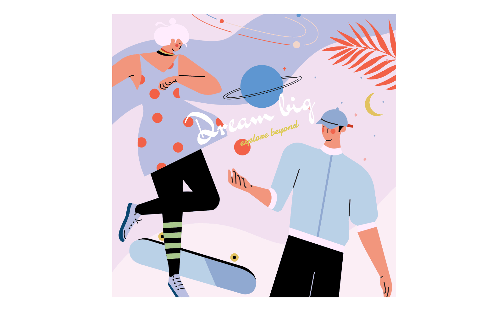 使用元素:人物、太空、植物、氛围、背景图形 | 配色风格:紫韵蓝雾