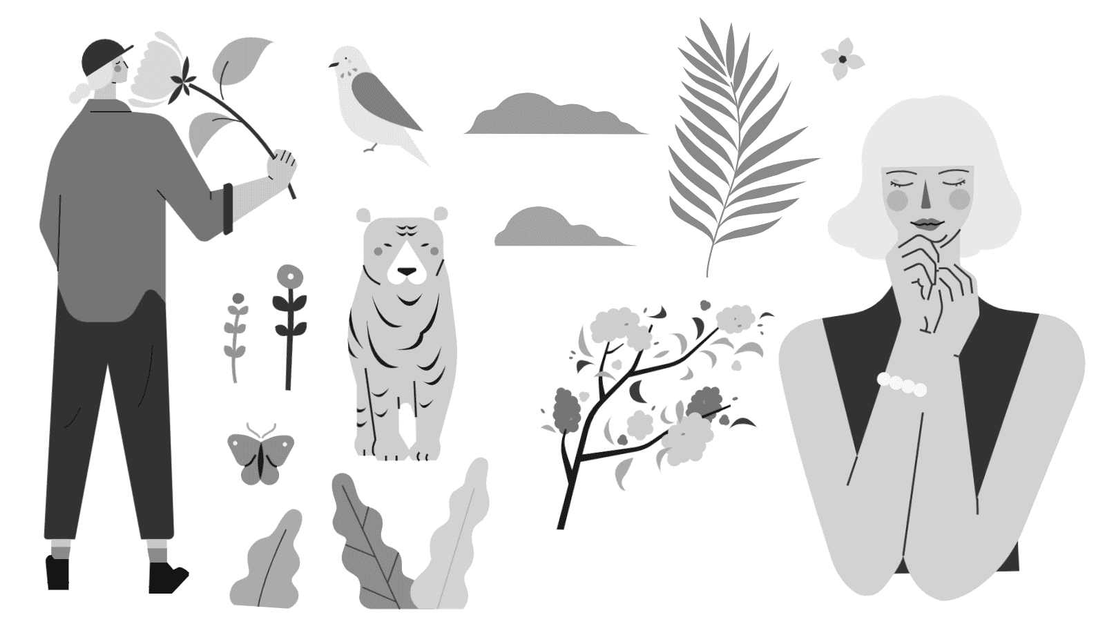 肖像和人物元素如果放在一个画面里,必定会产生一种景深空间感。这幅画运用了很多植物元素,表现出自然的蓬勃生机。
