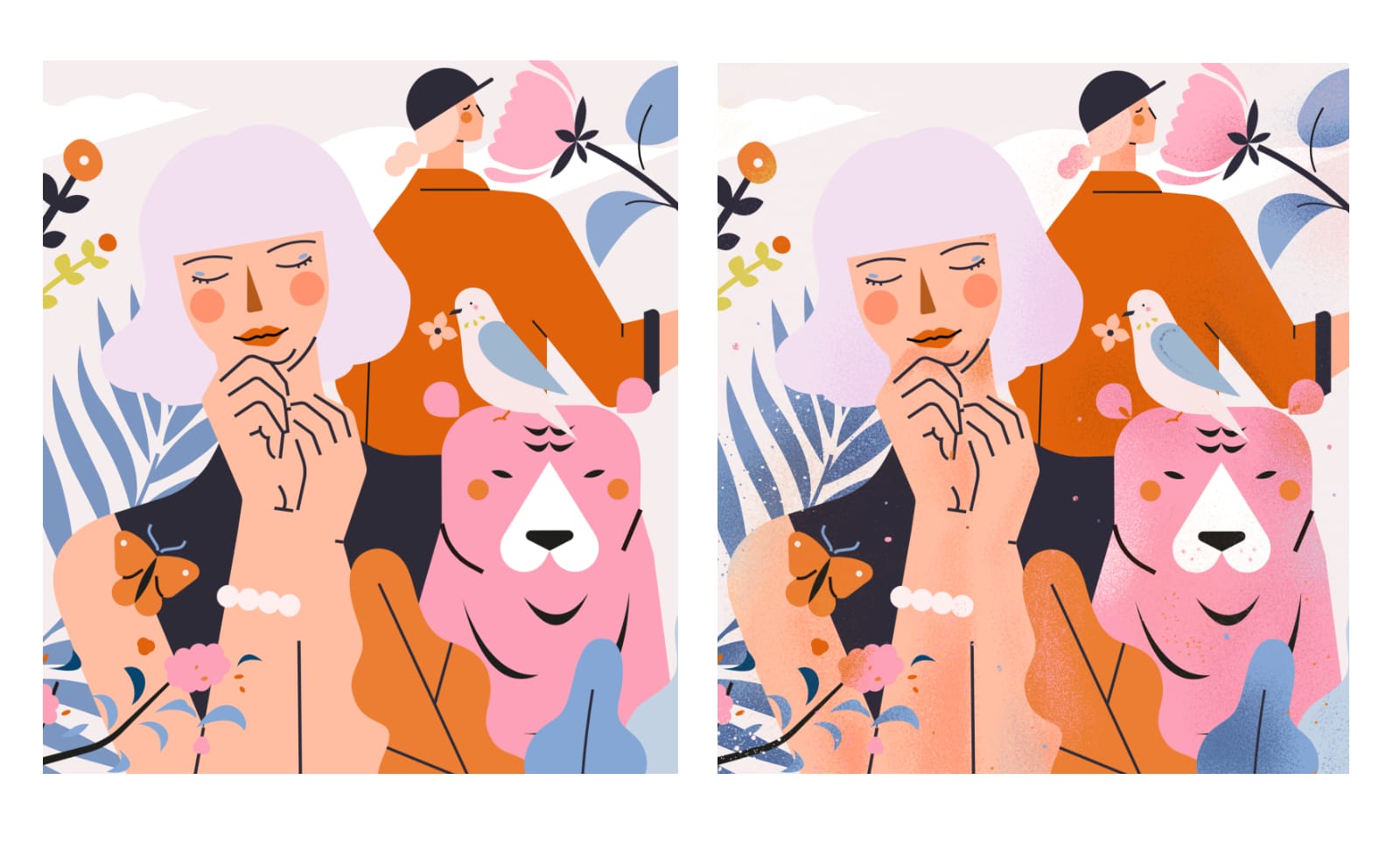 这幅作品我所使用的是紫云蓝雾这个配色,只是把主色重点放在了红色和粉色上面,让画面多了一份温柔和灿烂,少了蓝紫色的冷感。最后在PS里增加肌理和细节(右)。