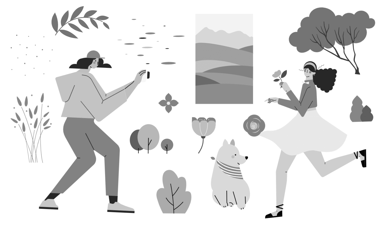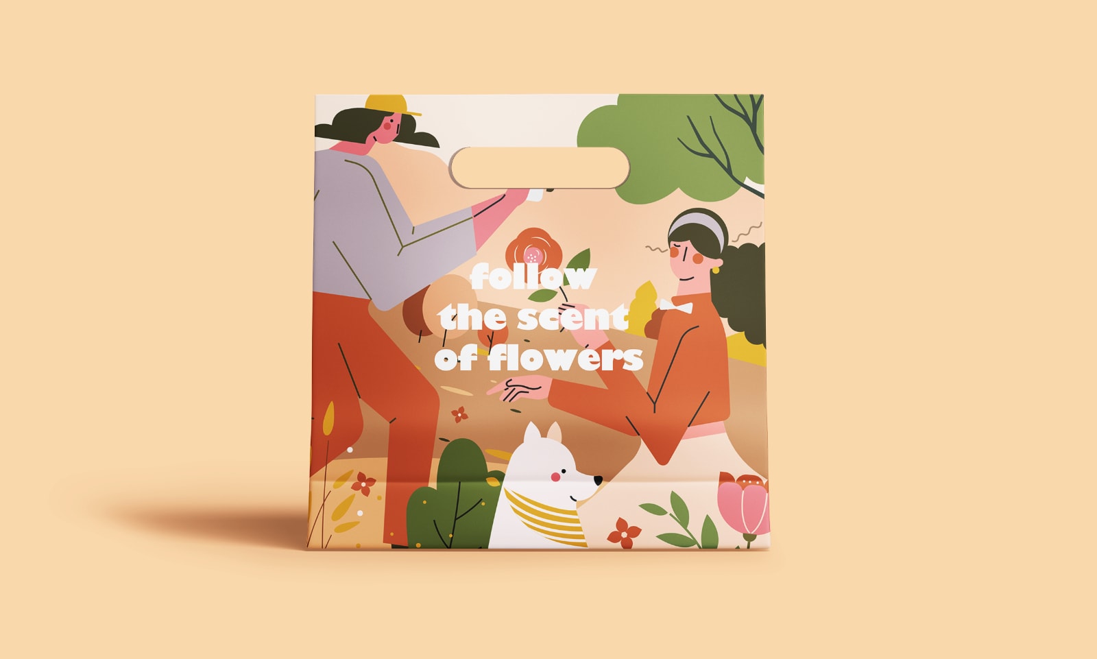 捕捉到那一瞬间 使用元素:人物、动物、植物、背景图形、氛围 | 配色风格:奶咖暖橘 开始编辑 主要使用元素 这次使用了相当多的植物元素,植物能组合成很具有自然特色的画面 完成作品 有时,为了烘托画面中的焦点,我让原本女孩手中握着的比较普通的花朵形替换成了较为细节化的花朵造型。奶咖暖橘是我比较常用的配色之一。 手提袋插画设计